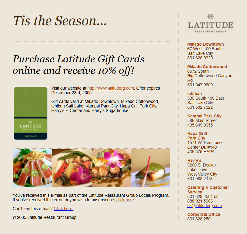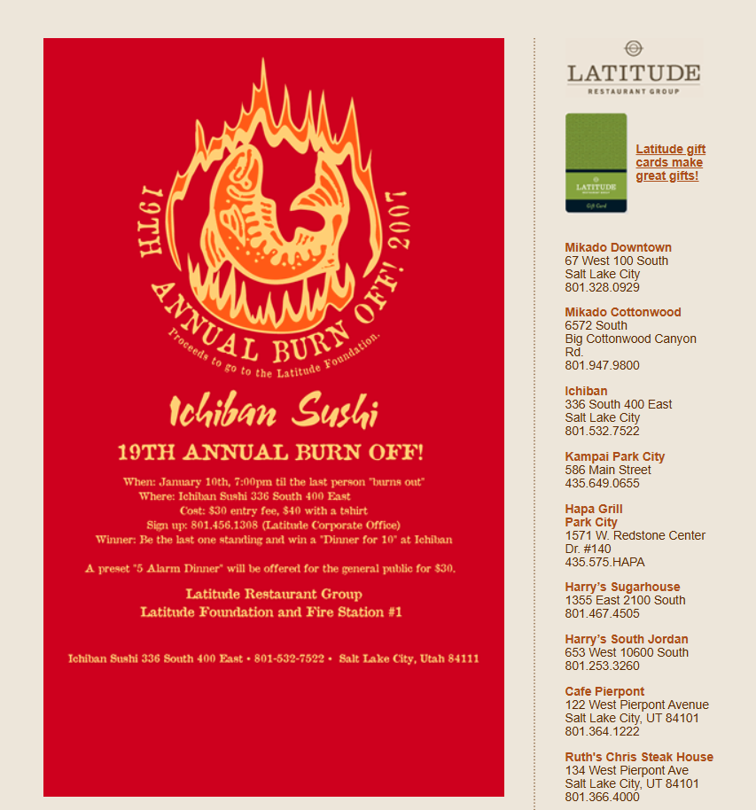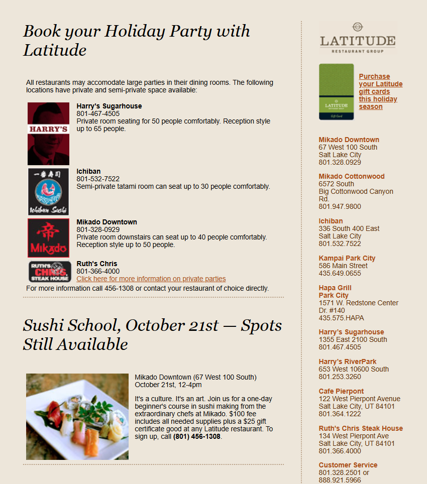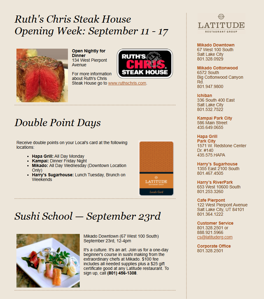 This restaurant management group with brands like Ruth's Chris, Harry's, and Ichiban Sushi retained me to create monthly email blasts showcasing upcoming events and specials the restaurants were running.