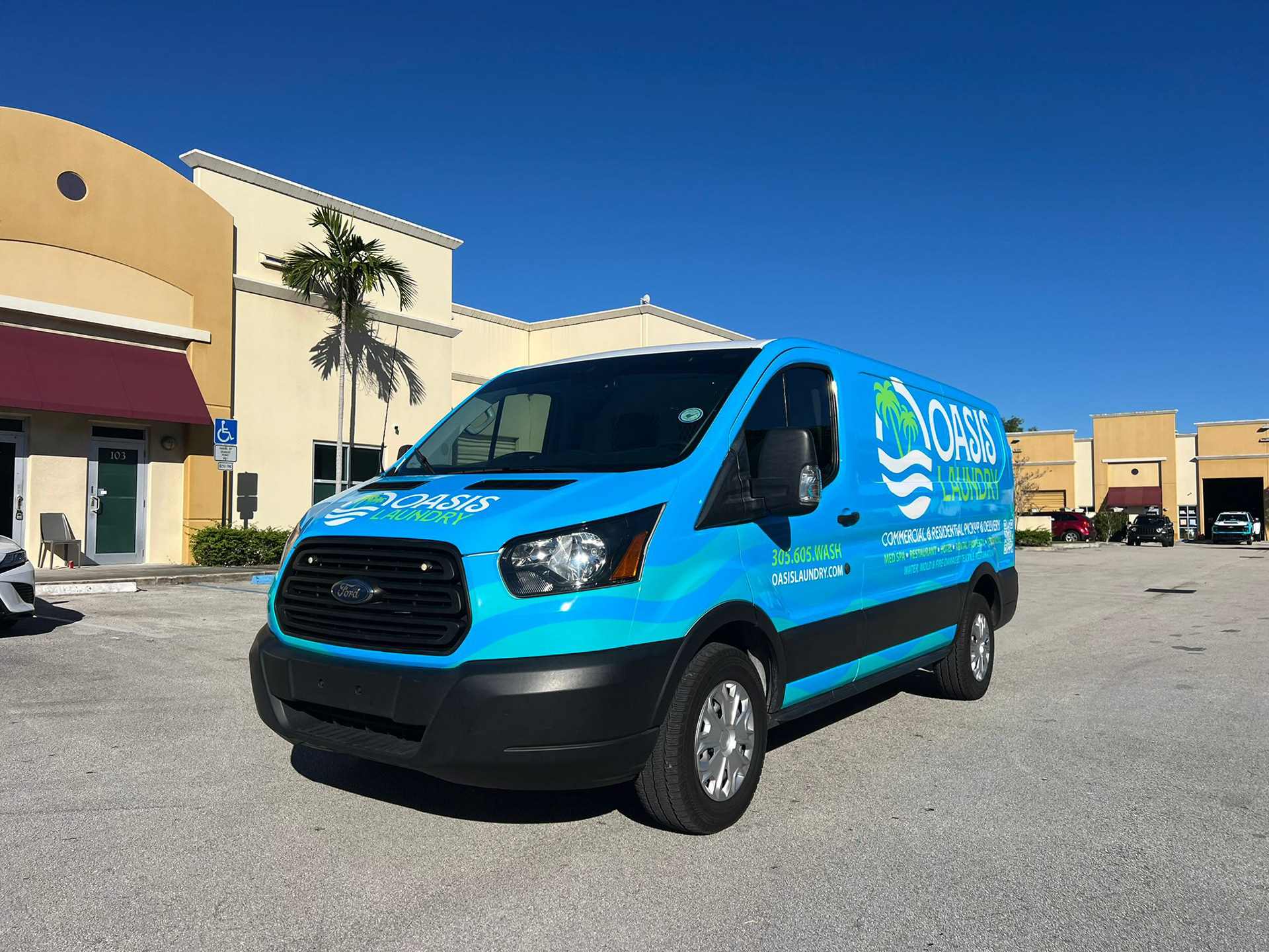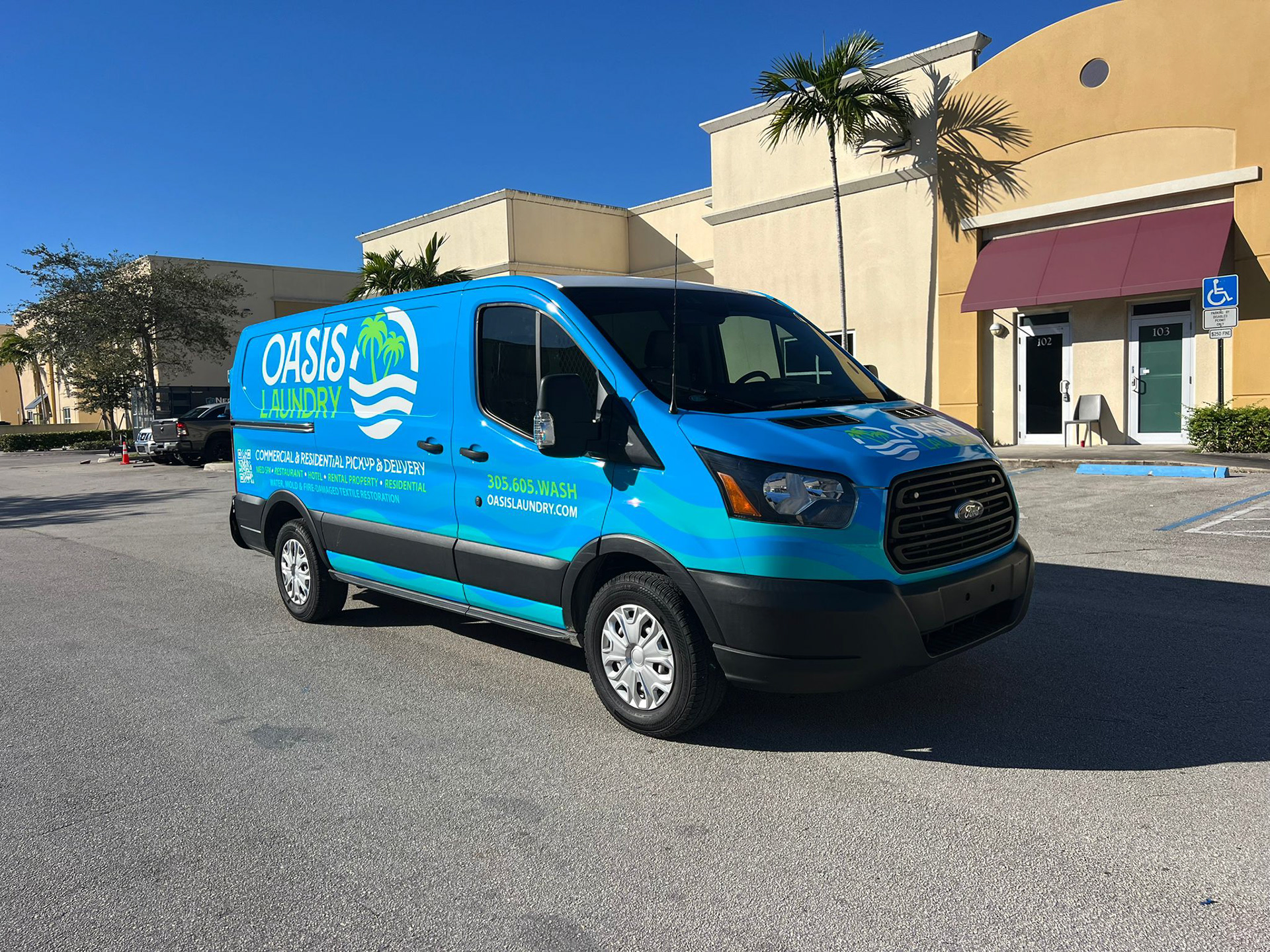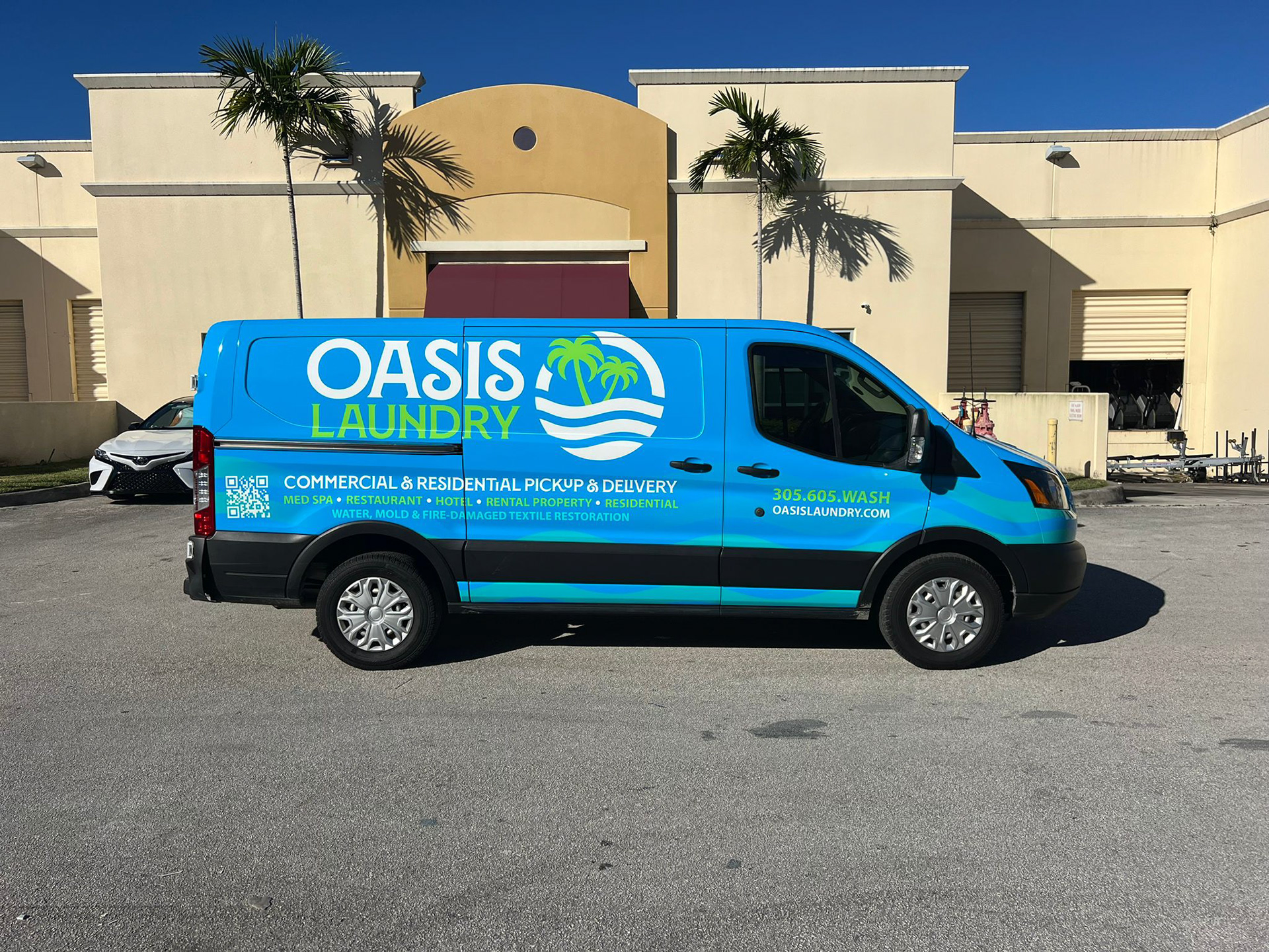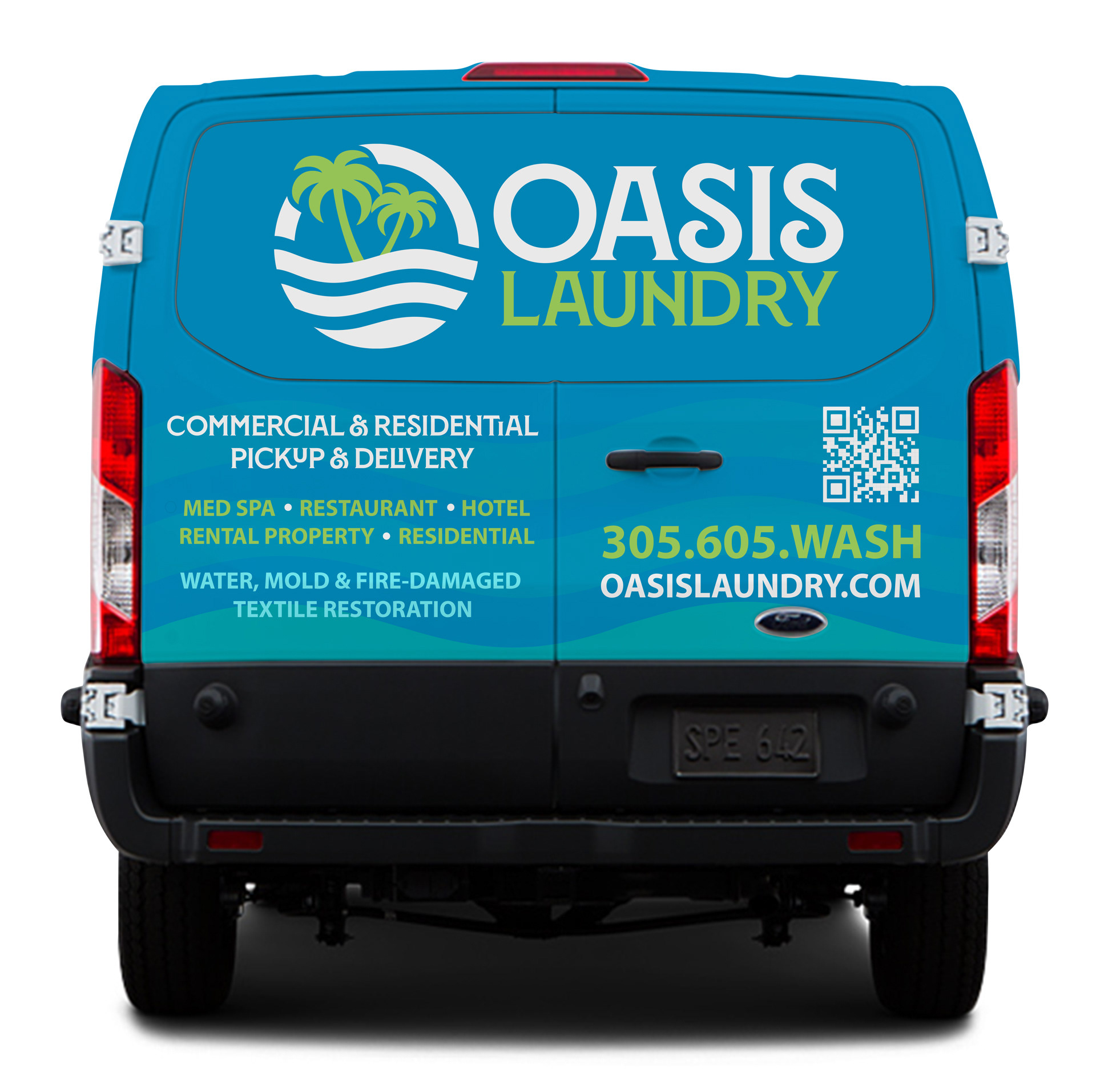 When Oasis Laundry started pickup & delivery service, the first couple months utilized employee vehicles or the gig economy. But once business started picking up, we needed a branded delivery van. Staying true to the branding and driving customer engagement with contact info and QR codes to enable easy scheduling on our custom app.